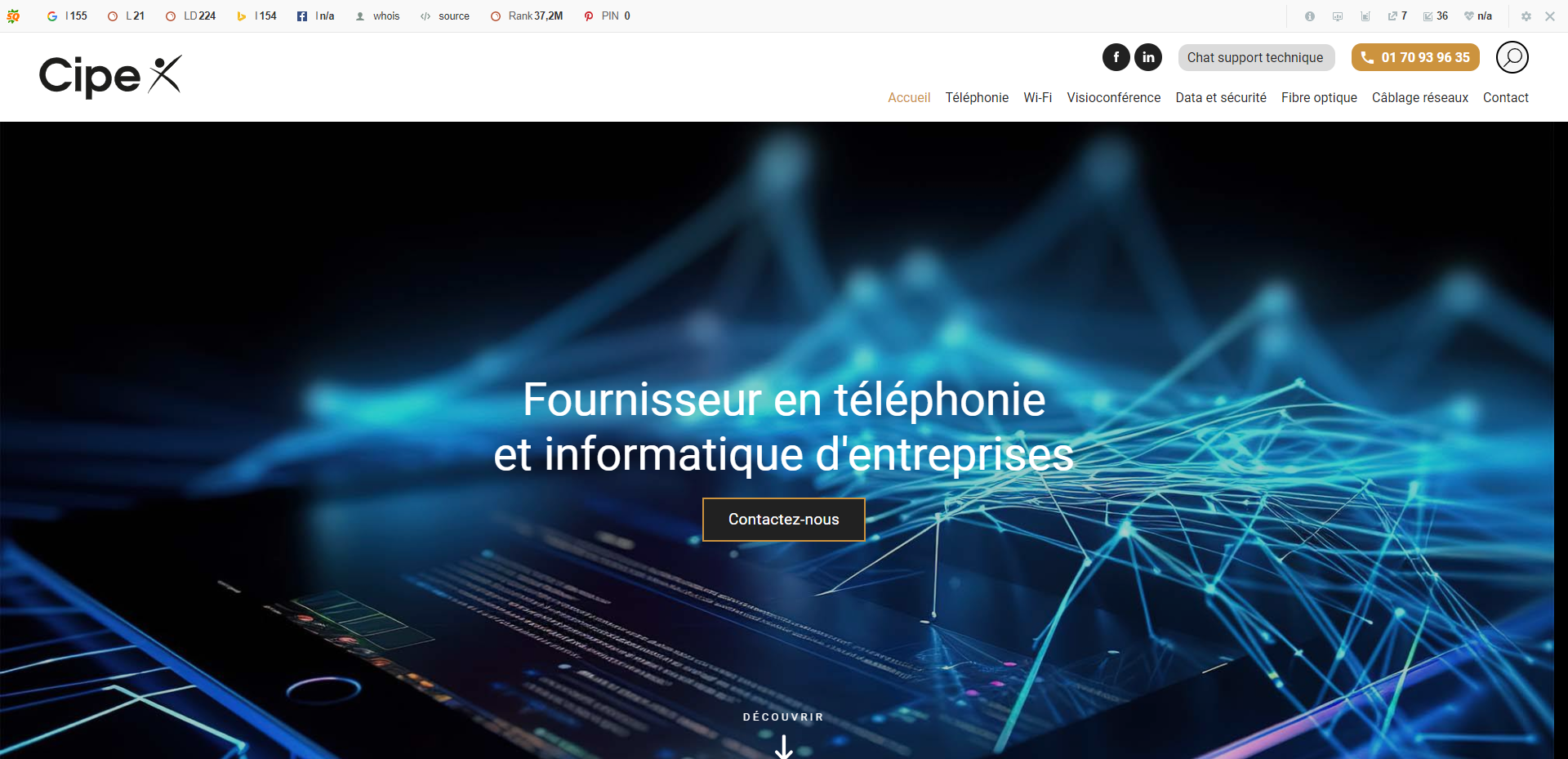 CIPE nous a fait confiance pour la mise en place de son site professionnel. Cette entreprise est spécialisée dans l’installation de téléphonie pour entreprise à Paris, Levallois-Perret, Boulogne-Billancourt et sur la France entière. Vous pourrez également bénéficier d’un accompagnement personnalisé pour la sécurisation de vos données. Téléphonie IP, VOIP ou cloud, internet très haut débit, réseau informatique ou encore solution de visioconférence : CIPE est un expert des professions réglementées. L’entreprise vous propose des solutions adaptées aux cabinets d’avocats, cabinets d’experts comptables, huissier de justice, ambulanciers et autres professions libérales. Pour en savoir plus, parcourez le tout nouveau site internet de cet installateur de téléphonie pour entreprises à Paris ! !