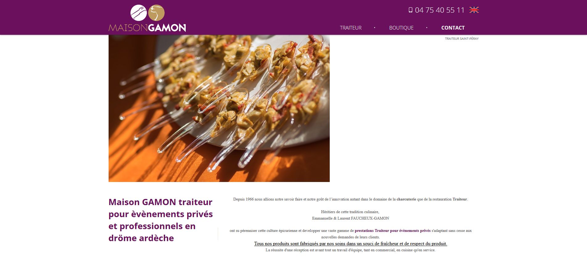 Organisation de réception pour un événement privé, pour un événement professionnel ou livraison de plateaux repas sur Valence : découvrez sur le site internet de Gamon Traiteur l'ensemble des prestations et services de cette société qui met les petits plats dans les grands pour assurer la réussite de votre réception. Buffet chaud ou froid, service à table, cuisine à la plancha : quelque soit le type d'événement, Gamon Traiteur réalise un service et prépare une cuisine en adéquation avec la thématique de l'événement.