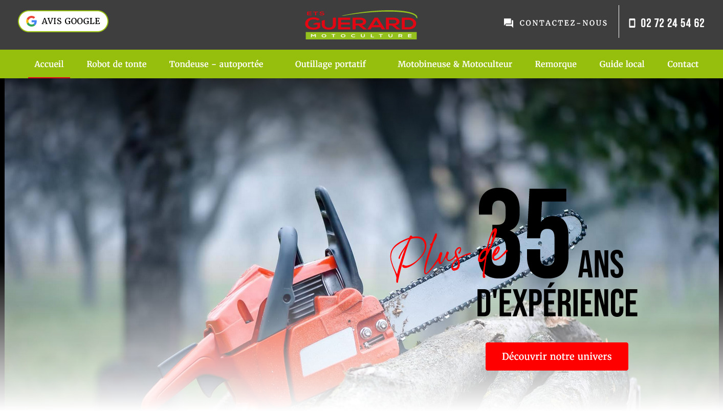Ets Guérard, ce sont 3 magasins qui vous accueillent dans le département de la Seine-Maritime (76) pour l'achat, l'entretien ou la réparation de vos motoculteurs et de votre matériel de jardinage. Tronçonneuses, tondeuses à gazon, tracteurs pelouse, taille-haies ou encore débroussailleuses : retrouvez un large choix de marques et de modèles pour les professionnels comme pour les particuliers. Vous aurez notamment la possibilité d'acheter du matériel pour jardin sans fil, avec des modèles fonctionnant sur batterie.