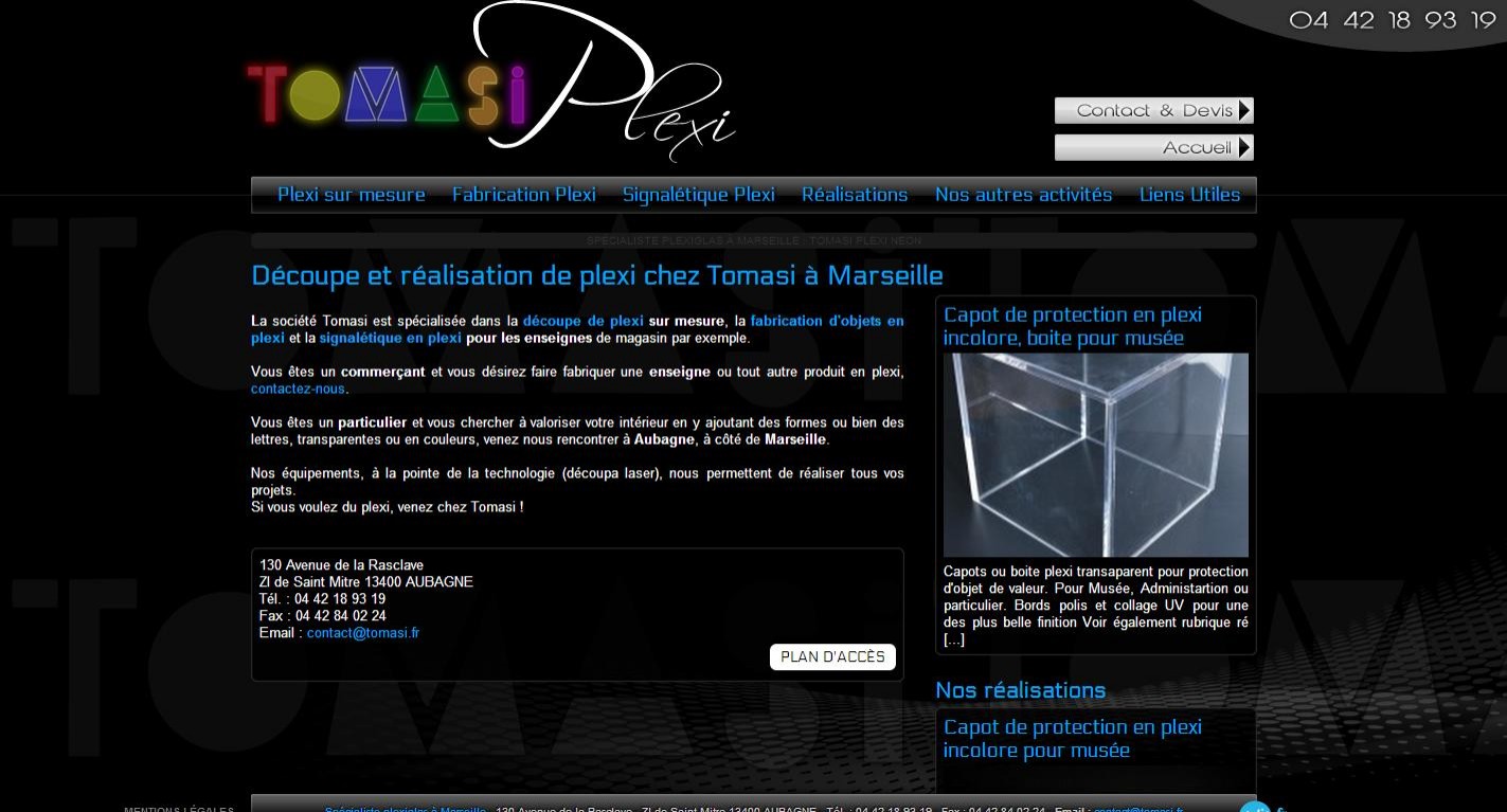 L’entreprise Tomasi est située à Aubagne 13400 et offre une gamme de services pour les particuliers et les professionnels autour de la vente de plexi sur-mesure à Marseille. La découpe du plexiglass n’a aucun secrets pour cette société qui réalise de nombreux objets et plaques de signalétique pour votre décoration ou votre enseigne. Sollicitez le savoir-faire d’une équipe passionnée par la création en plexi et au service de votre satisfaction.