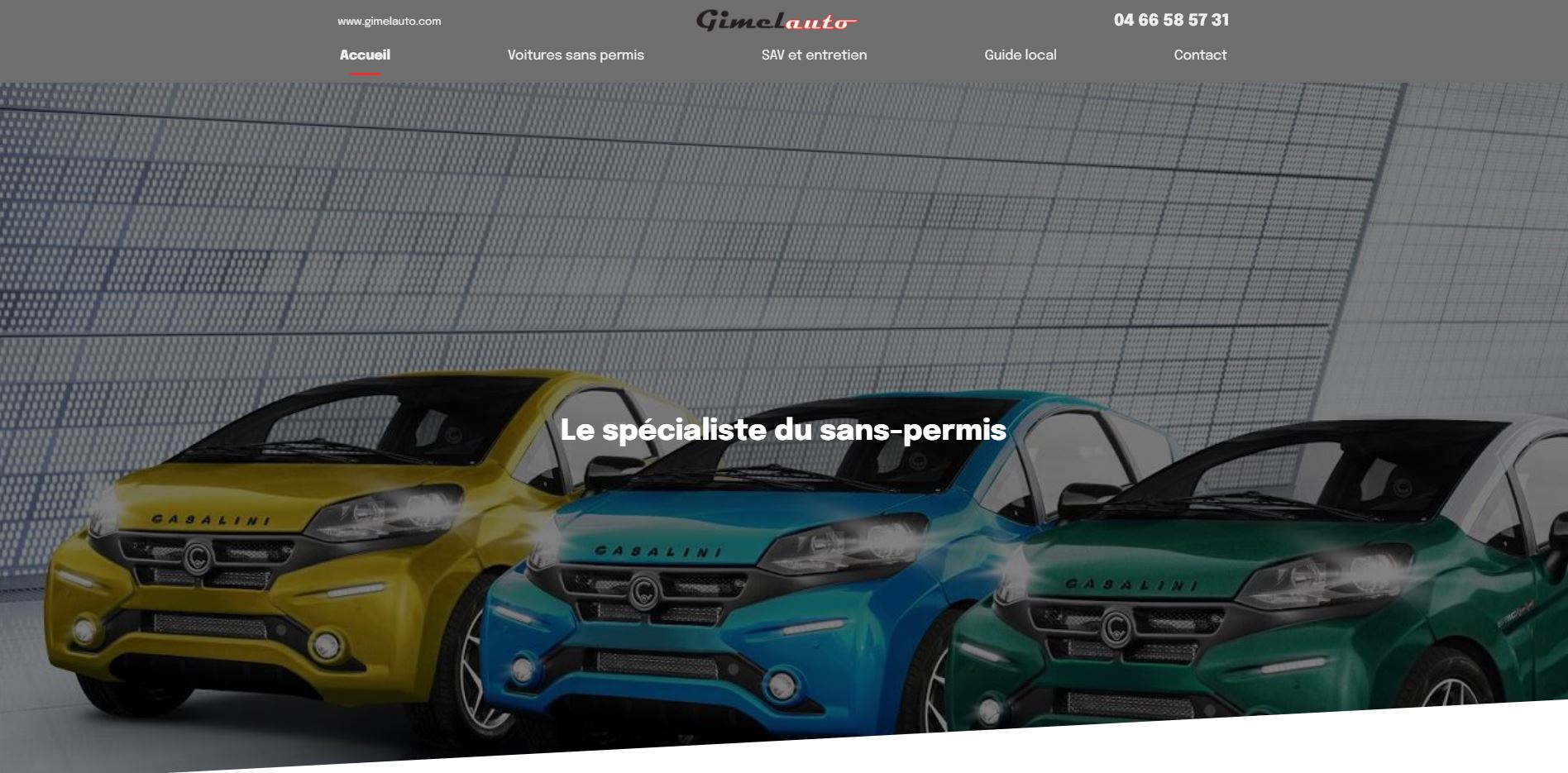 L'agence Jalis, spécialisée dans la création de site web, accompagne le garage et concessionnaire Gimel dans le déploiement de sa visibilité sur Internet. Il bénéficie désormais d'un site internet plus design et épuré, à limage de lentreprise. Le site est également responsive design, et sadapte aux différents écrans comme les ordinateurs, les tablettes et les smartphones. Découvrez le concessionnaire de voitures sans permis sur Sernhac - Gimel Automobiles. Il vous propose la vente de voitures sans permis neuves et d’occasion près de Nîmes. Des voiturettes idéales pour ses déplacements quotidien lorsque vous navez pas le permis. Le garage Gimel loue aussi des voitures sans permis pour courte ou longue durée au meilleur tarif. Découvrez également ses services de rachat et d'entretien des véhicules sans permis.